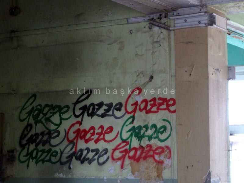 Tüm yapı “özgürlük”, “umut” ve “af” sözleriyle dolu. Bir de Filistin fotoğraf sergisnden kalan Gazze yazıları var. Her duvar, her yüzey bir şeylerin belgesi. Şu anda yıkımına başlanmış durumda, biz oradayken şantiye araçları dolaşıyordu ve ben bunların (bildiğim kadarıyla) belgelenmemesinden biraz rahatsızım. Neyse ki Yıldız Teknik Üniversitesinden bir grup öğrenci düzenli olarak gelip bu süreci gayri resmi olarak fotoğraflıyorlar. Oldukça kapsamlı bir de belgesel projeleri var, yapının içiyle sınırlı değil, ilgili kişilere ulaşıyorlar. Sayelerinde bu 40 yıl kaybolmayacak.