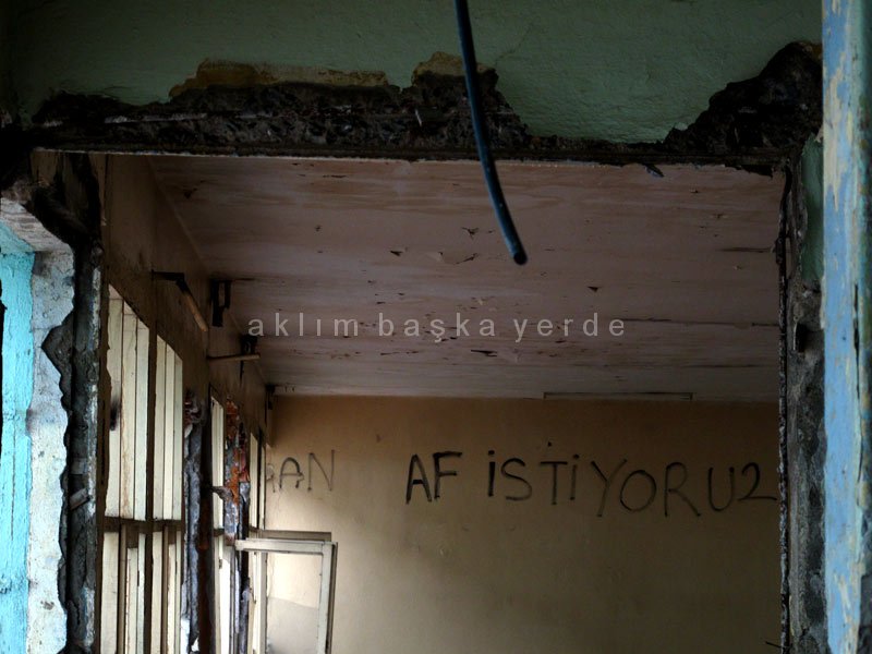 Tüm yapı “özgürlük”, “umut” ve “af” sözleriyle dolu. Bir de Filistin fotoğraf sergisnden kalan Gazze yazıları var. Her duvar, her yüzey bir şeylerin belgesi. Şu anda yıkımına başlanmış durumda, biz oradayken şantiye araçları dolaşıyordu ve ben bunların (bildiğim kadarıyla) belgelenmemesinden biraz rahatsızım. Neyse ki Yıldız Teknik Üniversitesinden bir grup öğrenci düzenli olarak gelip bu süreci gayri resmi olarak fotoğraflıyorlar. Oldukça kapsamlı bir de belgesel projeleri var, yapının içiyle sınırlı değil, ilgili kişilere ulaşıyorlar. Sayelerinde bu 40 yıl kaybolmayacak.