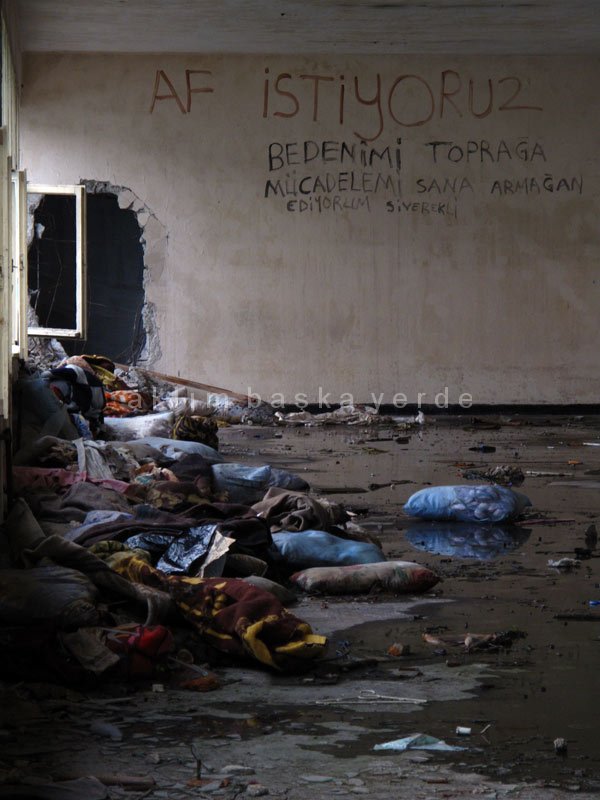 Yapıdakiler mahkumların aktarma esnasında sorun olabilecek bir şey organize etmelerini engellemek için habersizce ve bir gecede taşınmış. O kadar acele etmişler ki mahkumların kartları, mektupları, özel eşyaları bile geride kalmış. Bunlara verdikleri değer ve ne çok üzülmüş olabilecekleri fikri koğuşlarda havaya bir ağırlık indiriyor. Çiçekli duvar kağıtlarıyla rahatlıkla ayırdedilebilen Kadınlar Koğuşu’nda yerde birinin daha önce aynı koğuşta kaldığı birine attığı Yılmaz Güney kartını okumaya çalışıyoruz, geride kalması daha yıllarca hapishanede kalacak birinin hayatından çok şey eksiltmiştir herhalde.