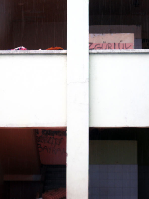Tüm yapı “özgürlük”, “umut” ve “af” sözleriyle dolu. Bir de Filistin fotoğraf sergisnden kalan Gazze yazıları var. Her duvar, her yüzey bir şeylerin belgesi. Şu anda yıkımına başlanmış durumda, biz oradayken şantiye araçları dolaşıyordu ve ben bunların (bildiğim kadarıyla) belgelenmemesinden biraz rahatsızım. Neyse ki Yıldız Teknik Üniversitesinden bir grup öğrenci düzenli olarak gelip bu süreci gayri resmi olarak fotoğraflıyorlar. Oldukça kapsamlı bir de belgesel projeleri var, yapının içiyle sınırlı değil, ilgili kişilere ulaşıyorlar. Sayelerinde bu 40 yıl kaybolmayacak.