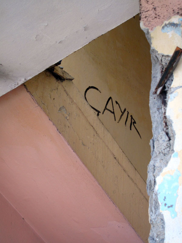 Tüm yapı “özgürlük”, “umut” ve “af” sözleriyle dolu. Bir de Filistin fotoğraf sergisnden kalan Gazze yazıları var. Her duvar, her yüzey bir şeylerin belgesi. Şu anda yıkımına başlanmış durumda, biz oradayken şantiye araçları dolaşıyordu ve ben bunların (bildiğim kadarıyla) belgelenmemesinden biraz rahatsızım. Neyse ki Yıldız Teknik Üniversitesinden bir grup öğrenci düzenli olarak gelip bu süreci gayri resmi olarak fotoğraflıyorlar. Oldukça kapsamlı bir de belgesel projeleri var, yapının içiyle sınırlı değil, ilgili kişilere ulaşıyorlar. Sayelerinde bu 40 yıl kaybolmayacak.